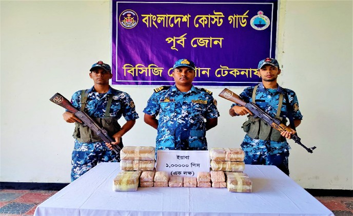 কক্সবাজারের টেকনাফ পৌরসভার নাইট্যং পাড়া এলাকা থেকে ১লাখ পিস ইয়াবা জব্দ করেছে বাংলাদেশ কোস্ট গার্ড ১৪ জুলাই শুক্রবার দুপুরে কোস্ট গার্ড সদর দপ্তরের মিডিয়া কর্মকর্তা লেফটেন্যান্ট কমান্ডার আব্দুর রহমান এ তথ্য জানান। তিনি বলেন,গোপন সংবাদের ভিত্তিতে, শুক্রবার ১৪ জুলাই আনুমানিক রাত ৪ ঘটিকায় বাংলাদেশ কোস্ট গার্ড পূর্ব জোন অধিনস্থ বিসিজি স্টেশন টেকনাফ কর্তৃক টেকনাফ থানাধীন নাইট্যং পাড়া নাফ নদী সংলগ্ন এলাকায় একটি বিশেষ অভিযান পরিচালনা করা হয়। অভিযান চলাকালীন নাইট্যংপাড়া বরফ কল সংলগ্ন প্যারাবন হতে দুইজন ব্যক্তিকে দুটি বস্তা হাতে লোকালয়ের দিকে যেতে দেখা যায়। উক্ত ব্যক্তিদ্বয়ের গতিবিধি সন্দেহজনক মনে হলে কোস্টগার্ড সদস্য কর্তৃক তাদের থামার সংকেত দেওয়া হয়। এসময় কোস্টগার্ড এর উপস্থিতি টের পেয়ে তারা বস্তা দুটি বনের মাঝে ফেলে দ্রুত লোকালয়ে পালিয়ে যায়। পরবর্তীতে কোস্ট গার্ড সদস্যরা প্যারাবনে তল্লাশী চালিয়ে দুইটি প্যাকেট থেকে মোট এক লক্ষ পিস ইয়াবা জব্দ করতে সক্ষম হয়। তিনি আরও বলেন,জব্দকৃত ইয়াবা পরবর্তী আইনানুগ ব্যবস্থা গ্রহণের জন্য টেকনাফ মডেল থানায় হস্তান্তরের কার্যক্রম প্রক্রিয়াধীন রয়েছে।