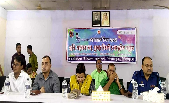 ইউএনও নুজহাত তাসনীম আওনের সভাপতিত্বে ও উপজেলা একাডেমিক সুপারভাইজার আব্দুস সালামের সঞ্চালনায় আলোচনা সভা হয়েছে। সভায় বক্তব্য রাখেন উপজেলা চেয়ারম্যান খায়রুল আলম রাজু, উপজেলা সহকারী কমিশনার(ভূমি) মুরাদ হোসেন, বিরামপুর থানার অফিসার ইনচার্জ সুব্রত কুমার সরকার, উপজেলা ভাইস চেয়ারম্যানদ্বয় উম্মে কুলসুম বানু ও মেজবাউল ইসলাম মন্ডল, বিরামপুর সরকারি কলেজের অধ্যক্ষ অদ্বৈত্য কুমার অপু, বিরামপুর মহিলা কলেজের অধ্যক্ষ মেজবাউল হক, বিরামপুর প্রেসক্লাবের সভাপতি মোরশেদ মানিক, আওয়ামীলীগ নেতা শিবেশ কুন্ডু, মুকুন্দপুর ইউপি চেয়ারম্যান আবুল কালাম, তথ্য প্রযুক্তি অধিদপ্তরের প্রোগ্রামার পাপিয়া নাসরীন, উপজেলা মসজিদের পেশ ইমাম মাওলানা মোখলেসুর রহমান প্রমুখ।