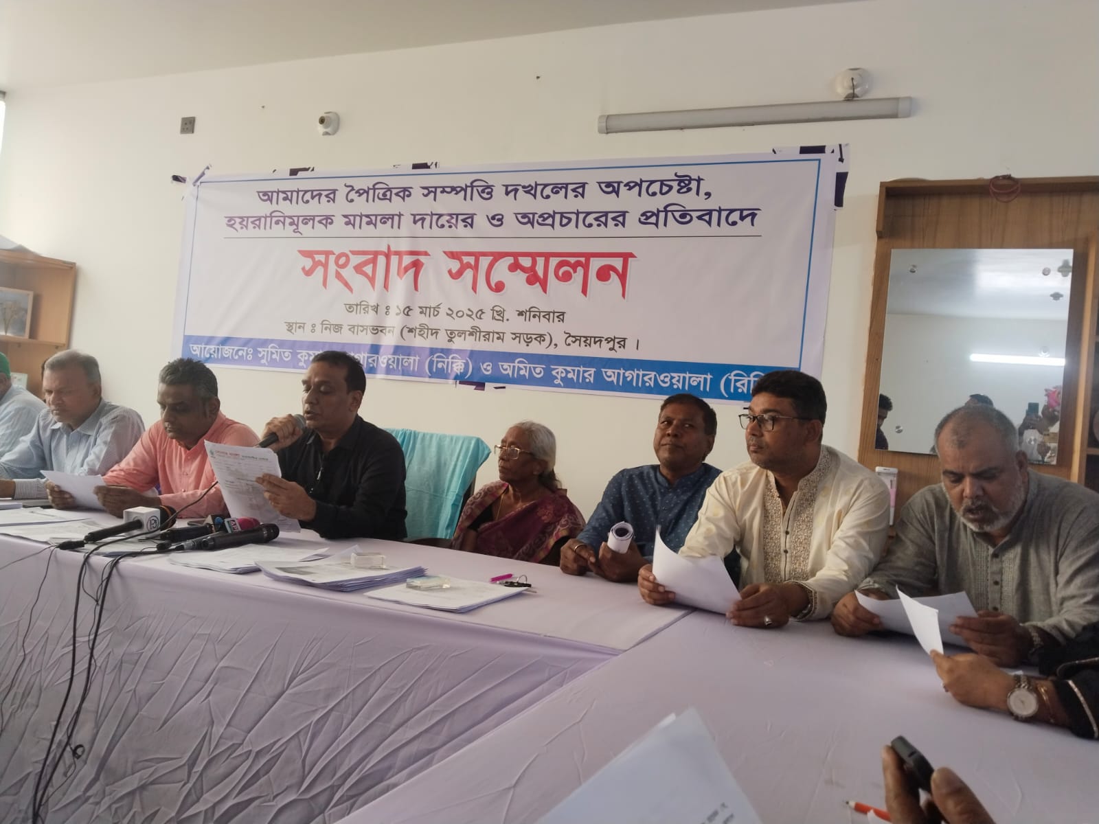 সংবাদ সম্মেলনে লিখিত বক্তব্যে সুমিত কুমার আগরওয়াল (নিক্কি) উপস্থিত সংবাদকর্মীদের জানান, আমাদের বাপ-দাদার ১শ’ ৩৫ শতক সম্পত্তি নিয়ে মাননীয় আদালতে ভাগ-বটোয়ার মামলা নং অন্য ১২১/১৮ চলমান থাকার পরেও সৈয়দপুরের ভুমিখেকো রেলের সম্পত্তি আত্মসাৎকারী আলতাফ হোসেন নিজেকে ভাড়াটিয়া সাজিয়ে জাল কাগজপত্র বানিয়ে দেশিও অস্ত্র-শস্ত্রসহ সাঙ্গপাঙ্গ নিয়ে গত ৮ মার্চ আমাদের সম্পত্তি দখল করতে এসে এলোপাথারি আক্রমন শুরু করলে আমার ছেলে গুরুতর আহত হওয়ায় তাকে স্থানীয় ১০০ শয্যা হাসপাতালে চিকিৎসা দেওয়া হয়।
