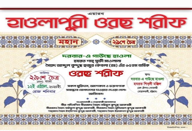 বোয়ালখালীর গাউছে হাওলা দরবারে হযরত শাহ্ সুফি মাওলানা সৈয়দ আব্দুল কুদ্দুছ (র.) এর ৬৫তম বার্ষিক ওরশ আগামী শনিবার অনুষ্ঠিত হবে। এতে দরবারের ভক্ত ও অনুরক্তদের উপস্থিত হবার জন্য দরবারের পীরজাদা সৈয়দ নঈমুল কুদ্দুছ আকবরীসৈয়দ সাইফুল কুদ্দুছ আকবরী, সৈয়দ মনিরুল কুদ্দুছ আকবরী ও শাহাজাদা সৈয়দ ইক্তিশাব কুদ্দুছ আকবরী অনুরোধ জানিয়েছেন।