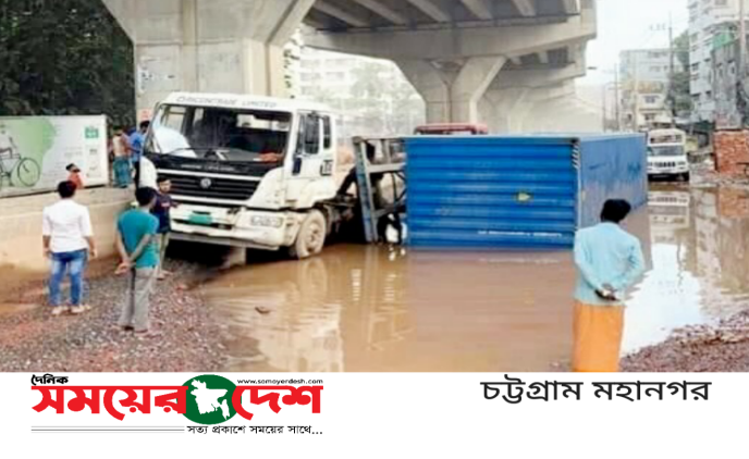 চট্টগ্রাম নগরীর ইপিজেড থানাধীন বন্দরটিলা এলাকায় ভাঙা সড়কে উল্টে গেছে এক কন্টেইনারবাহী লরি। আজ বৃহস্পতিবার ২৮ জুলাই ভোর সাড়ে ৬টার দিকে এ দুর্ঘটনা ঘটে।