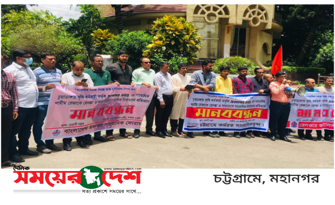 আজ শনিবার বেলা ১২ টায় চট্টগ্রাম নগরীর কোতোয়ালি থানা এলাকার চরাগী পাহাড় মোড় সাংবাদিক পাড়ায় এক বিশাল মানববন্ধন এর আয়োজন করা হয়। উক্ত মানববন্ধনে চুয়াডাঙ্গা কৃষি কর্মকর্তা কতৃক দৈনিক সকালের সময় সাংবাদিক শামীম রেজা ও বাংলাদেশ মফস্বল সাংবাদিক সোসাইটি'র যুগ্ম মহাসচিব সাংবাদিক নুর আলমগীর অনুকে মিথ্যা মামলাও হেনেস্তার প্রতিবাদে এক বিশাল মানববন্ধন ও প্রতিবাদ বিক্ষোভ সভার আয়োজন করা হয়।