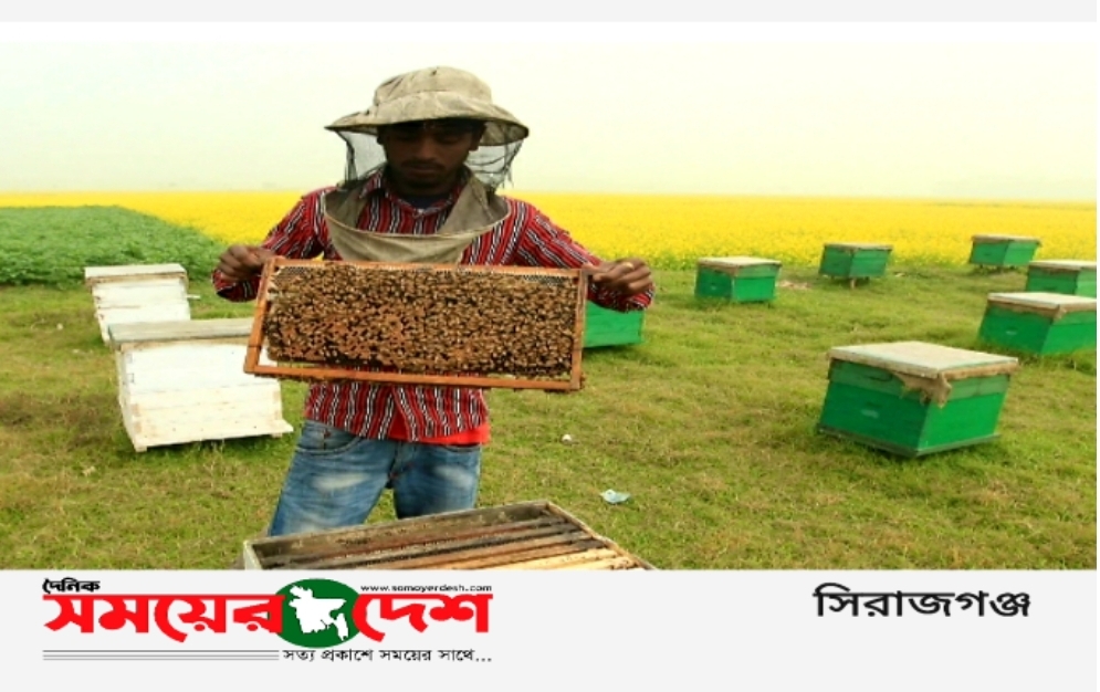 সিরাজগঞ্জ উল্লাপাড়া উপজেলার বিভিন্ন মাঠে মাঠে এখন সরিষার হলুদ ফুলে শোভা পাচ্ছে মনোরম দৃশ্য। পুরো মাঠ ঢেকে আছে হলুদ বর্ণের চাদর। সুন্দর ও অপরূপ দৃশ্যের আলোকে মধু চাষিরা ব্যস্ত হয়ে পড়ছেন সরিষার ক্ষেত্রে মৌমাছি দিয়ে মধু সংগ্রহের কাজে। উপজেলার বিভিন্ন এলাকার মাঠ ঘুরে এমন চিত্র দেখা গেছে। এই মৌসুমে ফসলের জমির পাশে পোষা মৌমাছি দিয়ে শত শত বক্স স্থাপন করে মধু সংগ্রহ করেছেন মৌ চাষিরা। ওইসব বক্স থেকে পোষা মৌমাছি গুলো উড়ে গিয়ে মধু সংগ্রহের জন্য ঘুরে বেড়াচ্ছে সরিষার হলুদ ফুলে। মৌ চাষিরা সাধারণত পছন্দের একটি সরিষার ক্ষেতের পাশে খোলা জায়গায় চাক ভরা বক্স ফেলে রাখেন । তাতে একেএকটি বক্সে মোম দিয়ে তৈরি ছয় থেকে সাতটি মৌচাকের ফ্রেম থাকে। আর তার ভেতরে রাখা হয় একটি রানী মৌমাছি রানী মৌমাছির কারণেই ওই বক্সে মৌমাছিরা আসতে থাকে । মৌমাছিরা ফুল থেকে মধু এনে বক্সের ভেতরের চাকে জমা করে। আর এই চাক থেকেই মধু সংগ্রহ করে থাকে চাষিরা। প্রতিদিন সকাল ৮টা থেকে বিকেল ৫টা পর্যন্ত মৌ-চাষিরা এসব মৌচাক থেকে মধু সংগ্রহ করে থাকেন উল্লাপাড়া উপজেলা বাঙালা ইউনিয়নের ইসলামপুর মাঝিপাড়া, ধরইল গ্রামের মাঠে সরিষার ফুল থেকে মধু আহরনের পদ্ধতি সম্পর্কে চাষী মনজু ইসলাম জানান, প্রায় দশ বছর হলো মধু আহরন ব্যবসার সাথে জড়িত তিনি। তিনি আরো জানান, আমরা সরিষার ক্ষেএ থেকে বছরে চার মাস মধু সংগ্রহ করে থাকি । প্রায় ২০ থেকে ২৫ লাখ টাকা মূলধন নিয়ে মৌ খামারি ব্যবসায় নেমেছি। উল্লাপাড়া বাঙালা ইউনিয়নের ইসলামপুর মাঝি পাড়া ধরইল গ্রামের বিস্তীর্ণ সরিষার ক্ষেতে ২১০টি বক্স বসিয়ে আট দিনে গড়ে প্রায় ৭শ' কেজি সংগ্রহ করেছেন বলে তিনি জানান।